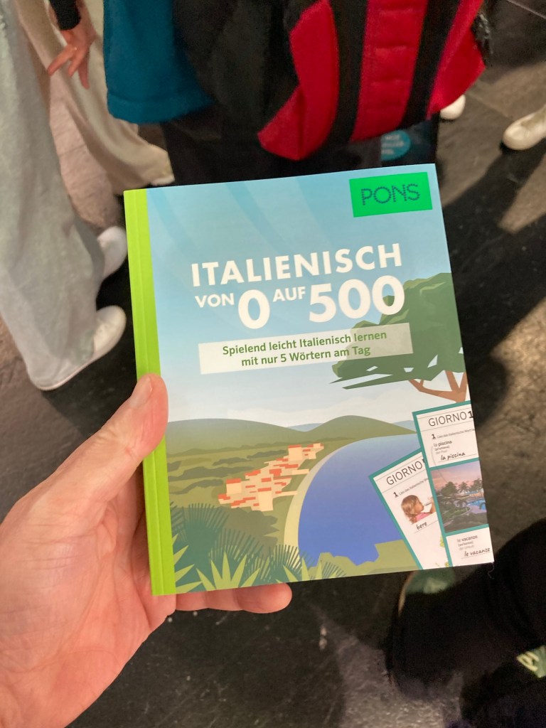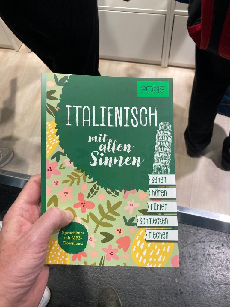 Wir haben ein wenig Zeit und streifen durch die Halle 4. Ich bekomme einen halben Herzinfarkt, weil unser Sohn sich immer wieder unserer Aufmerksamkeit entzieht und auf eigene Faust die Stände erkundet. Entnervt finde ich ihn am Stand der Bundeszentrale für politische Bildung. Man hat ihm eine Aufgabe gegeben. Er muss an sechs Ständen Fragen beantworten. Bei der richtigen Antwort bekommt er einen Stempel und wenn er alle Stempel zusammen hat, bekommt er eine Belohnung. Na endlich ist er sinnvoll beschäftigt. Ich gehe mit ihm los und suche die ersten Stände. Zwischendurch springen mich bei Pons ein paar Italienisch-Lernbücher an. Anfang November besuche ich einen Italienischkurs in der Volkshochschule und es ist vielleicht gar nicht schlecht, wenn ich mein Urlaubsitalienisch noch ein wenig vor dem Kursbeginn vertiefe.