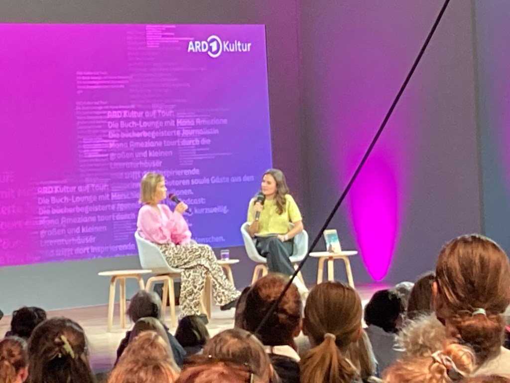 Als wir an der Lesebühne ankommen, nimmt Caroline Wahl gerade auf der Bühne Platz. Ihr Debütroman „22 Bahnen“ liegt immer noch bei mir auf der Bettablage. Meine Tochter hat den Roman gelesen und war sehr angetan von der Geschichte und jetzt ist Frau Wahl hier um den Nachfolgeroman „Windstärke 17“ zu bewerben. Im Gespräch mit Mona Ameziane berichtet sie über das neue Buch, ihre plötzliche Berühmtheit und ihr Art zu schreiben. Ein angenehmes Gespräch. Ich habe nicht den Eindruck, dass Frau Wahl hinterm Berg hält und sie wirkt mit ihrer leichten Exzentrik sehr authentisch und sympathisch.