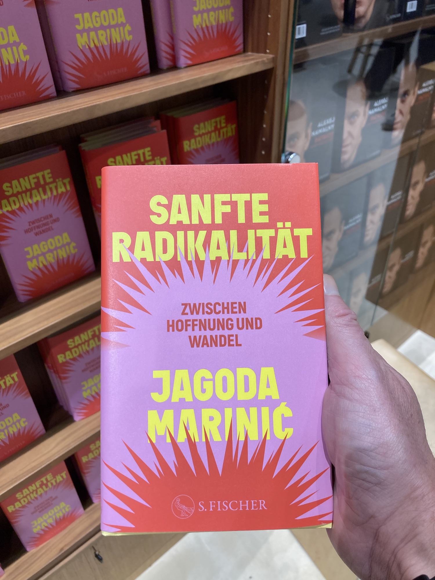 Gesättigt von den vielen Eindrücken verzichte ich freiwillig auf Saskia Fröhlich, der ich auf Insta folge und die mit ihrem Buch „Introvertriert“ auf der Buchmesse unterwegs ist und auf Mithu Sanyal die mit ihrem neuen Werk „Antichristie“ auf den Bühnen der Buchmesse allgegenwärtig war. Irgendwo war auch Jagoda Marinic unterwegs, deren neues Buch „sanfte Radikalität“ ich bei S.Fischer entdeckt hatte. Wir schweifen noch durch Halle 3.0 und 3.1, die sich am späten Nachmittag langsam leerten und kaufen Bücher ein. Mein Sohn beendet die kleine Schnitzeljagd der Bundeszentrale für politische Bildung und bekommt als Lohn eine Tasse, die ich am nächsten Tag leider aus Unachtsamkeit zerdeppert habe.
