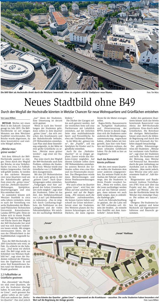 Der eine Artikel erzählt von einer Vision, die zu schön klingt, um wahr zu sein. Eine Studentengruppe hat sich im Rahmen eines Projektes den Chancen gewidmet, die sich für die Wohnquartiere in der Innenstadt ergeben könnten: Neue günstige Wohnungen für Familien, ein neues Quartier eingebettet in das alte Viertel rund um den Bahnhof, mit einem Fahrradschnellweg, Carsharing-Angeboten, weniger Autos, viel Grün, viel Nachhaltigkeit. Wenn man weiß, wie in den letzten Jahren Wetzlar städtebaulich entwickelt wurde, erwartet man nichts von alledem.