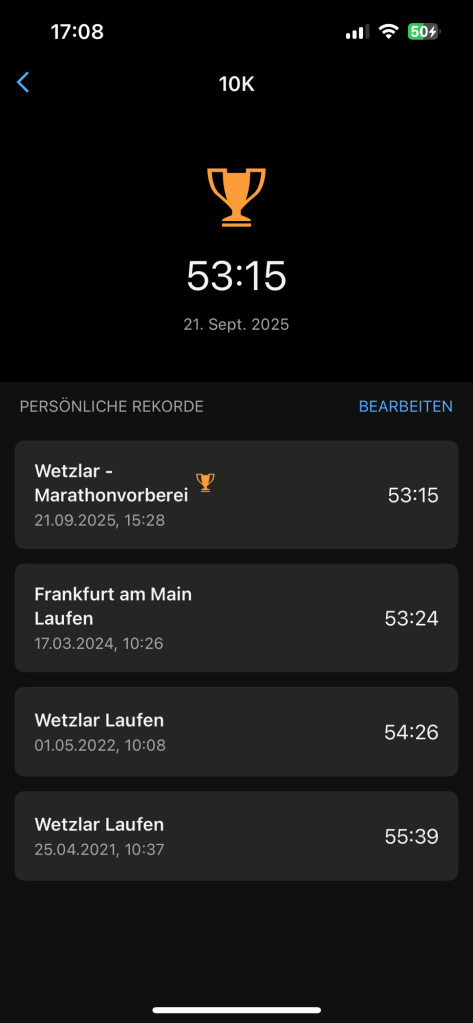 Fünf Wochen sind vergangen, fünf Wochen liegen noch vor mir. Und um das Bergfest angemessen zu feiern, habe ich meine PB (persönliche Bestzeit) auf der Zehn-Kilometer-Strecke um ein paar Sekunden verbessert und das im strömenden Regen. Ein versöhnlicher Abschluss für eine wechselhafte und launische Woche. Ich habe zweimal spät abends nach der Arbeit in der Dunkelheit laufen müssen. Ich bin immer zu spät nach Hause gekommen und habe zu Hause alles stehen und liegen gelassen, um einmal 60 Minuten und einmal 70 Minuten zu Laufen. Mental hat das bei mir Spuren hinterlassen und gerade am Donnerstag, nach ungefähr vier Kilometer, wäre ich am liebsten einfach stehen geblieben und nach Hause gegangen. Ich weiß nicht, wie ich mich immer wieder motivieren kann. Gerade jetzt, wo es abends früher dunkel wird, ich viel zu spät nach Hause komme und mein Leben neben dem Laufen auch organisieren muss. Natürlich sage ich mir immer wieder, dass ich ein Ziel habe und nach dem 26.10. wieder zu meinem alten Laufpensum zurückkehre. Wahrscheinlich bin ich von Natur aus einfach zu stoisch und zu engstirnig, wenn es um persönliche Ziele geht. Habe ich mich einmal von einem Plan überzeugt, bleibe ich dabei. Wahrscheinlich keine schlechte Eigenschaft, wenn man Marathon laufen möchte. Am Freitag und Samstag war dann der körperliche Tiefpunkt erreicht. Erschöpft von der Woche, vielen Termine und den Wetterschwankungen, hat sich eine Erkältung angekündigt. Meine Nase lief und ich war schlapp. Am Samstag Nachmittag, der angeblich letzte Sommertag des Jahres, sollte ich vierzig Minuten laufen und dabei das Lauftempo steigern. Das lief sehr gut und danach war mein Schnupfen verschwunden. Heute Morgen hat es angefangen zu regnen. Ich war nach dem guten Lauf am Samstag wieder motiviert und hatte mir vorgenommen, auch im Regen zu laufen. Ein gute Übung für den 26.10. Denn Ende Oktober kann das Wetter durchaus eklig sein, kalt, regnerisch und das den ganzen Tag über. Im Trainingsplan war ein 10-Kilometer-Lauf vorgesehen (Zeitempfehlung: 51 Minuten). Das war klar, schaffe ich nicht. Ist auch nicht schlimm. Mittags war ich mit meinen Kindern bei MC-Donalds und der Hamburger mit Zwiebeln sprach die ersten drei Kilometer mit mir. Seitenstechen und mehrere Rülpser führten dazu, dass ich entscheidende Sekunden auf der Strecke liegen lassen musste. Und trotzdem bin ich PB gelaufen!!!! Schon ab Kilometer acht habe ich es in den Zehenspitzen gefühlt: eine PB liegt in der feuchten Luft. Zum ersten mal mit 47.51 Minuten bin ich bei acht Kilometern unter 48 Minuten geblieben. Ich bin drangeblieben und am Ende verkündete meine Garmin meinen Rekord!! Auf dem letzten Kilometer lief mir ein anderer Läufer hinterher und als ich fertig war mit meinen zehn Kilometer, lief er an mir vorbei und rief mir zu, das ich ihn jetzt noch einmal richtig motiviert hätte, weil ich so schnell unterwegs war….als er weg war, habe ich einen ziemlichen Männerjubel von mir gegeben. Ein echt geiler durchnässter Abschluss für dieses Bergfest.