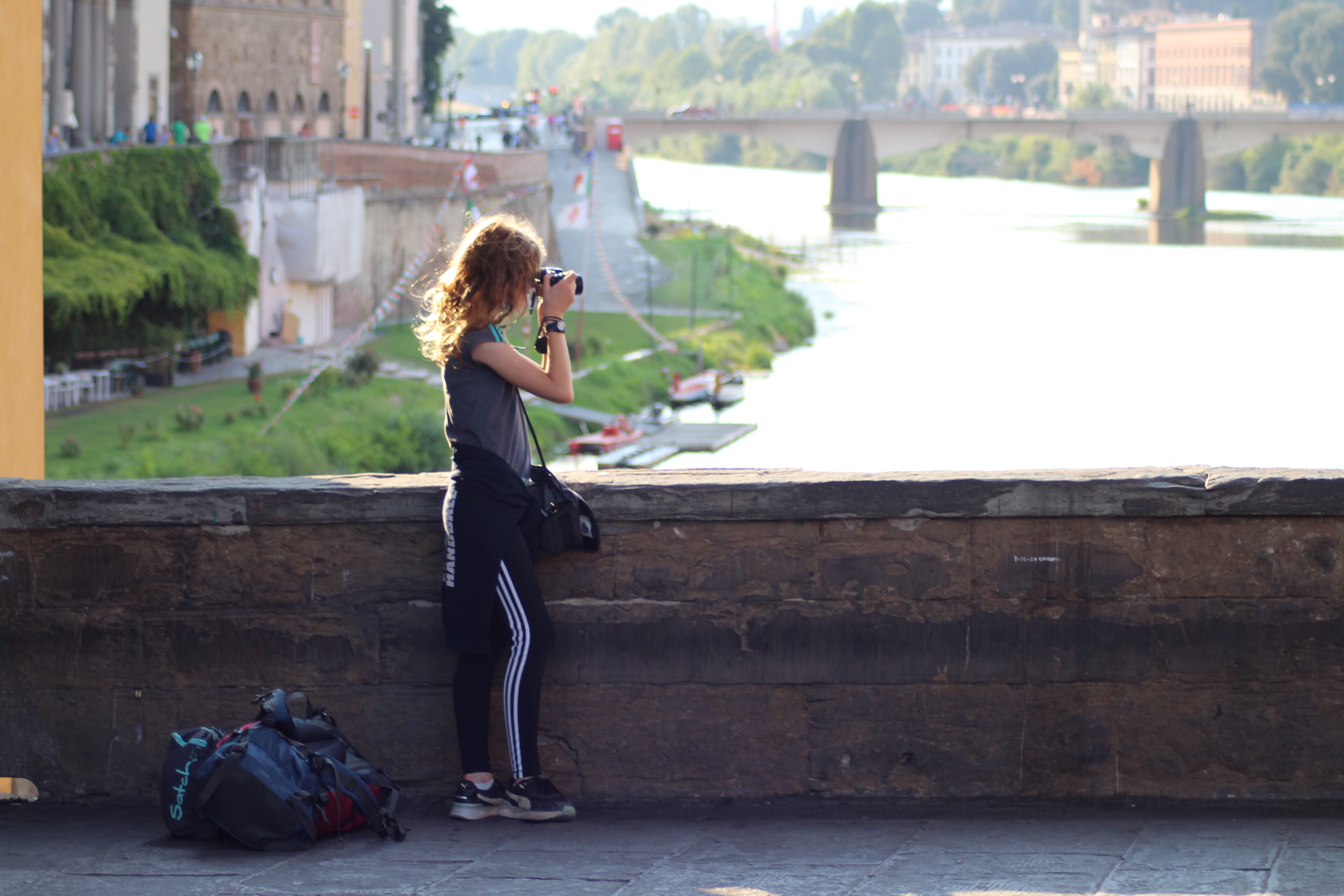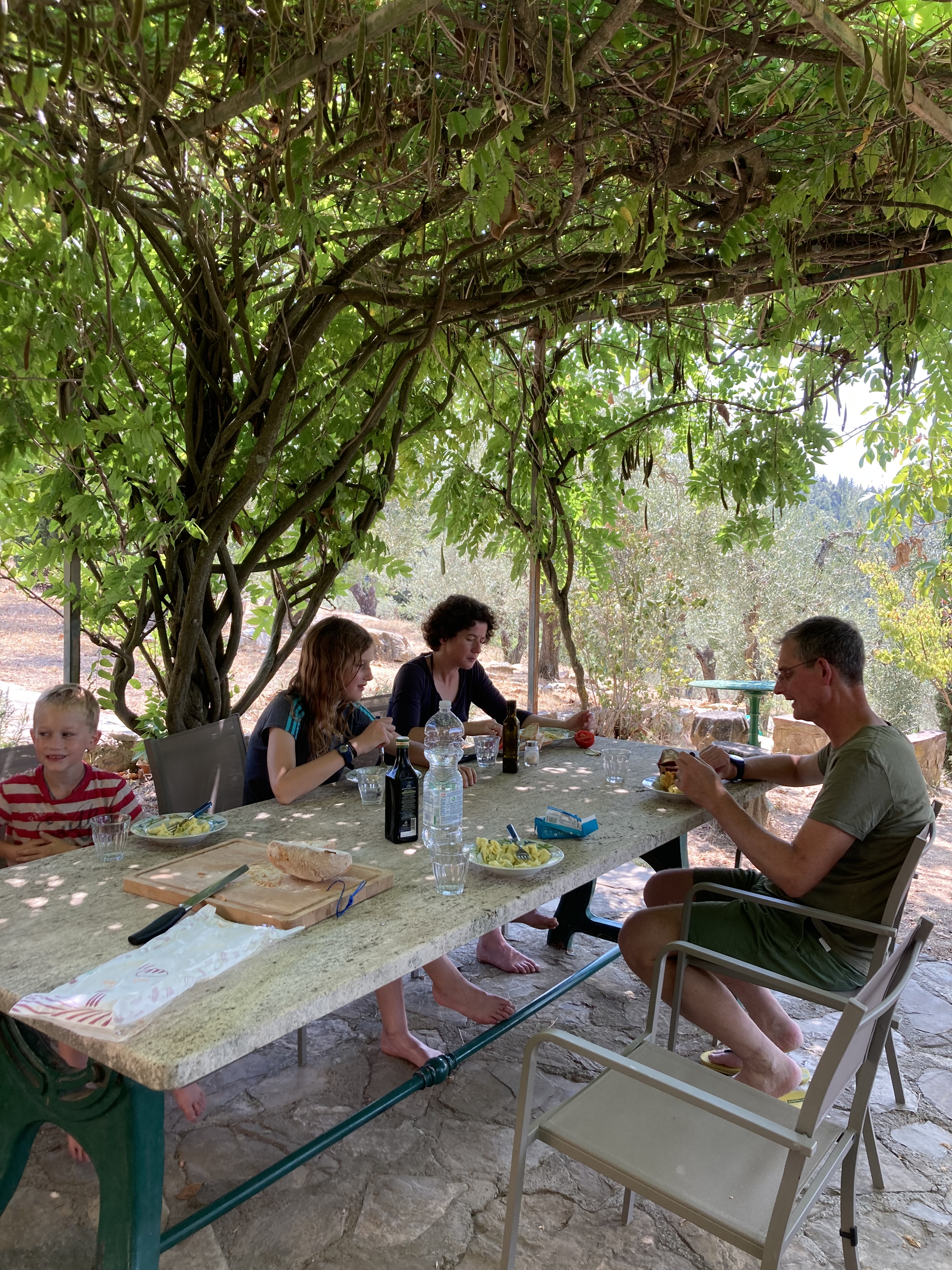 Unsere Autovermietung machte erst um neun Uhr auf. Es war Sonntag und wir waren froh, dass die Autovermietung in der Innenstadt überhaupt geöffnet hatte. Ansonsten hätten wir in Florenz an den Flughafen fahren müssen. Wir nutzten die Zeit und schlenderten zum Dom und der Ponte Vecchio. Was für ein schöner Urlaubsbeginn: Im Morgenlicht auf der menschenleeren Ponte Vecchio stehen und den Arno hinaufschauen.  Um halb neun schlugen wir unser Lager vor der Autovermietung auf. Wir wollten die ersten sein. Um neun machte die Autovermietung auf und hinter uns hatte sich eine Schlange von Touristen gebildet, die sich alle ein Auto mieten wollten. Eine halbe Stunde später saßen wir im Auto auf dem Weg nach Poggibonsi. In Poggibonsi haben wir erst einmal im Coop eingekauft und sind dann zu unserer Wohnung gefahren. Mittags saßen wir zum ersten Mal auf unserer schattigen Terrasse und haben den Ausblick auf die einmalige Landschaft genossen. Wir waren an unserem Sehnsuchtsort angekommen.