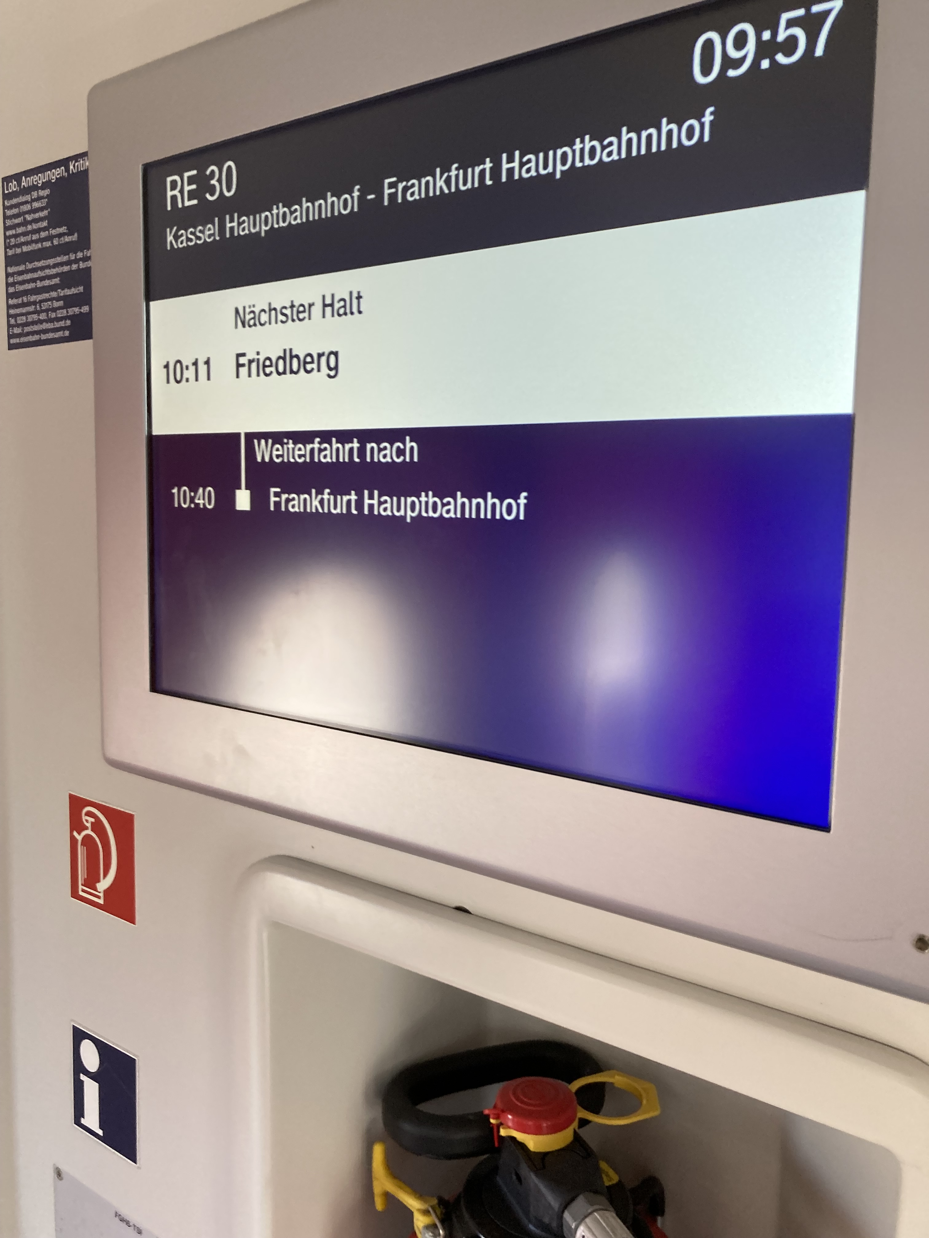 Der Zug in Wetzlar fuhr pünktlich um halb zehn los. In Giessen ging es weiter mit dem RE 30. Leider steht auf allen Anzeigetafeln, dass der Zug in Frankfurt Hauptbahnhof endet. Die Züge aus Mittelhessen halten baustellenbedingt nicht mehr am Frankfurter Hauptbahnhof, sondern an Bahnhof Süd in Frankfurt. Wer in Süd aussteigt, kann mit der Straßenbahn ohne Probleme an den Hauptbahnhof kommen. Wer allerdings glaubt, er erreicht direkt den Frankfurter Bahnhof und hat die Umsteigezeit in einen anderen Zug zu knapp bemessen, wird wohl seinen Anschlusszug verpassen. Gerade Fahrgäste, die von außerhalb kommen, werden hier unter Umständen ein Reisefiasko erleben. Zum Teil verlängert sich die Fahrzeit um eine Stunde.